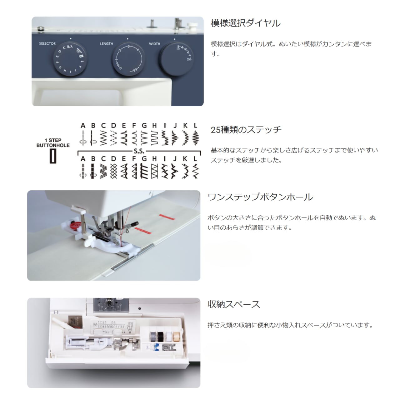 おしゃれなミシンランキング常連ミシン。使い勝手もとてもシンプル。ボタンホールを含む25種類のステッチが可能で、3段階で押え圧が調整できるため、薄地や厚地もきれいに縫えます。気軽にミシンを始めたい、ミシン初心者の方におススメです。見た目もスタイリッシュで、お部屋の雰囲気を一気にステキににしてくれますよ♪